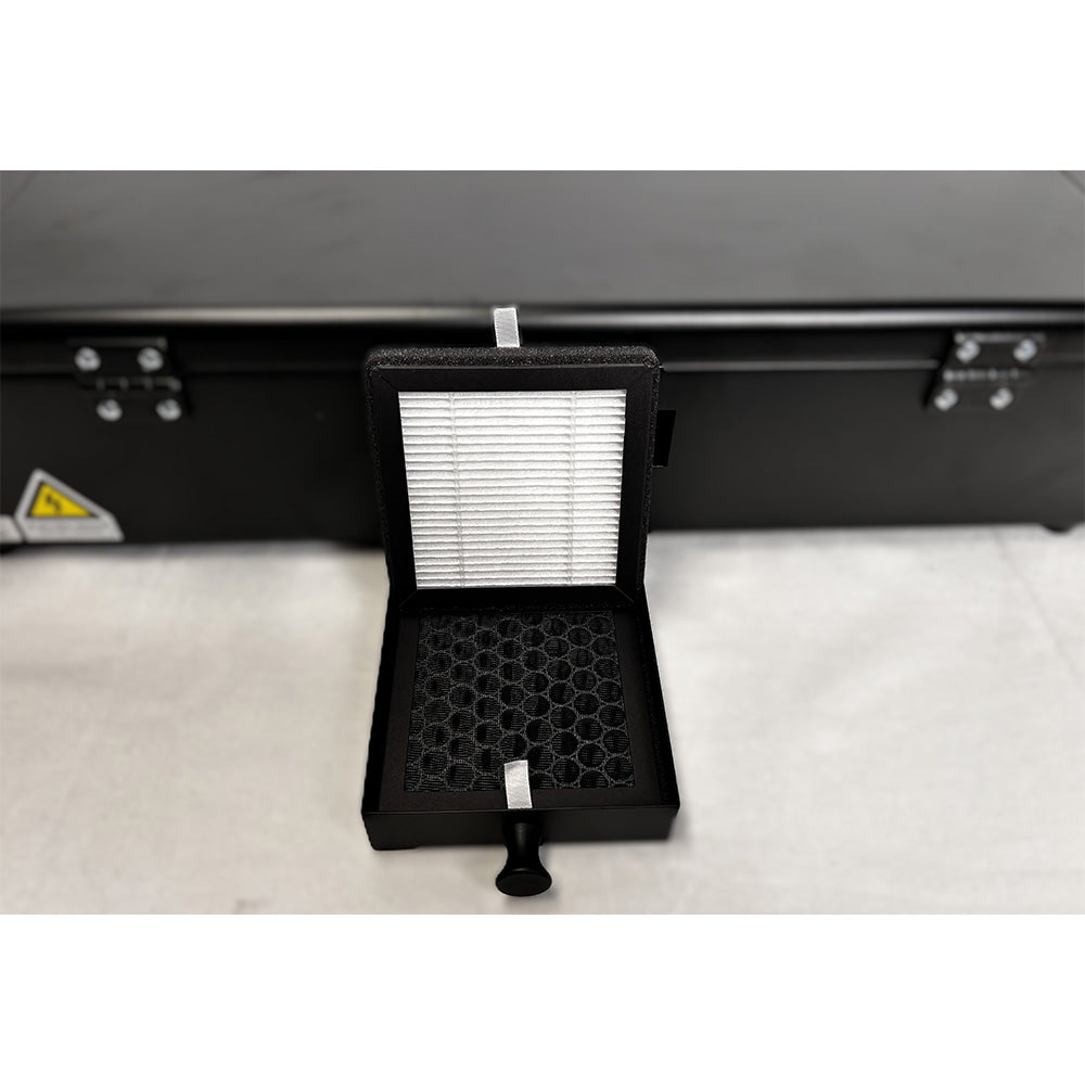 WAARSCHUWING: Werk in een GOED GEVENTILEERDE RUIMTE en gebruik beschermende uitrusting bij het werken met DTF-producten en -processen. Het gebruik van een dampafzuiger wordt sterk aanbevolen om de dampen te verwerken die ontstaan bij het uitharden van TPU-lijmpoeder. Lichaamsbescherming, inclusief het gebruik van PBM's zoals een volledige lichaamsbedekking, een ademhalingsmasker / N95-masker, een veiligheidsbril en handschoenen, wordt aanbevolen ter bescherming tegen TPU-lijmpoeder (vóór het uitharden) dat door de behandeling in de lucht kan komen. Inademing van TPU-lijmpoeder of dampen kan schadelijk zijn voor uw gezondheid. Het gebruik van DTF-apparatuur, chemicaliën, poeders, inkt en alle accessoires is geheel voor eigen risico van de gebruiker. DTF-apparatuur is bedoeld voor gebruik in een commerciële omgeving. Het wordt afgeraden om DTF-apparatuur in een woonomgeving of thuis te gebruiken. DTF-inkten en -folie vereisen een omgeving met een goede luchtvochtigheid - een luchtvochtigheid van meer dan 50% wordt sterk aanbevolen om het risico op inktverstoppingen en het kromtrekken van de folie te minimaliseren. Voeg een dampafzuiger toe aan dit pakket voor voldoende dampafzuiging.